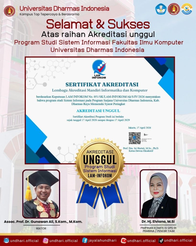 www.gemaundhari.com- Dharmasraya, Kabar membanggakan datang dari dunia pendidikan tinggi di Sumatra Barat. Program Studi S1 Sistem Informasi, Fakultas Ilmu Komputer Universitas Dharmas Indonesia (UNDHARI), resmi meraih Akreditasi Unggul dari Lembaga Akreditasi Mandiri Informatika dan Komputer (LAMINFOKOM) berdasarkan keputusan LAM INFOKOM No. 051/SK/LAM-INFOKOM/Ak/S/ IV/ 2026.